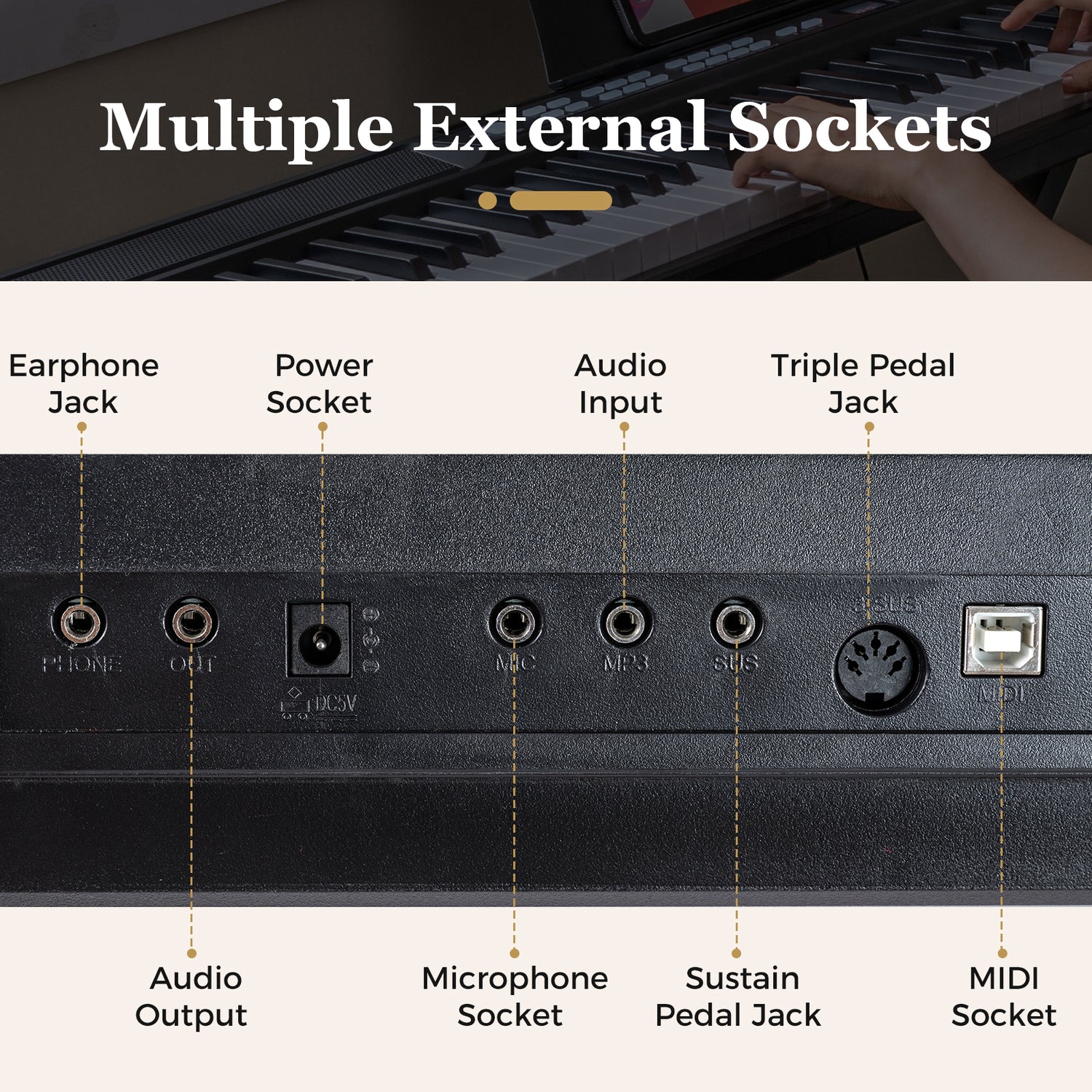 The electronic piano keyboard has 128 tones, 128 rhythms, and 80 demos, allowing users to freely play. The chord, transpose, metronome, and keyboard drum functions are also included. Full size sensitive keyboard helps you make the sound effect lighter or louder. The adjustable stand and padded stool ensure optimal comfort for any player. Additionally, there are different external jacks: earphone jack, audio output, power socket, microphone socket, audio input, sustain pedal jack, sustain pedal jack, and MIDI socket.