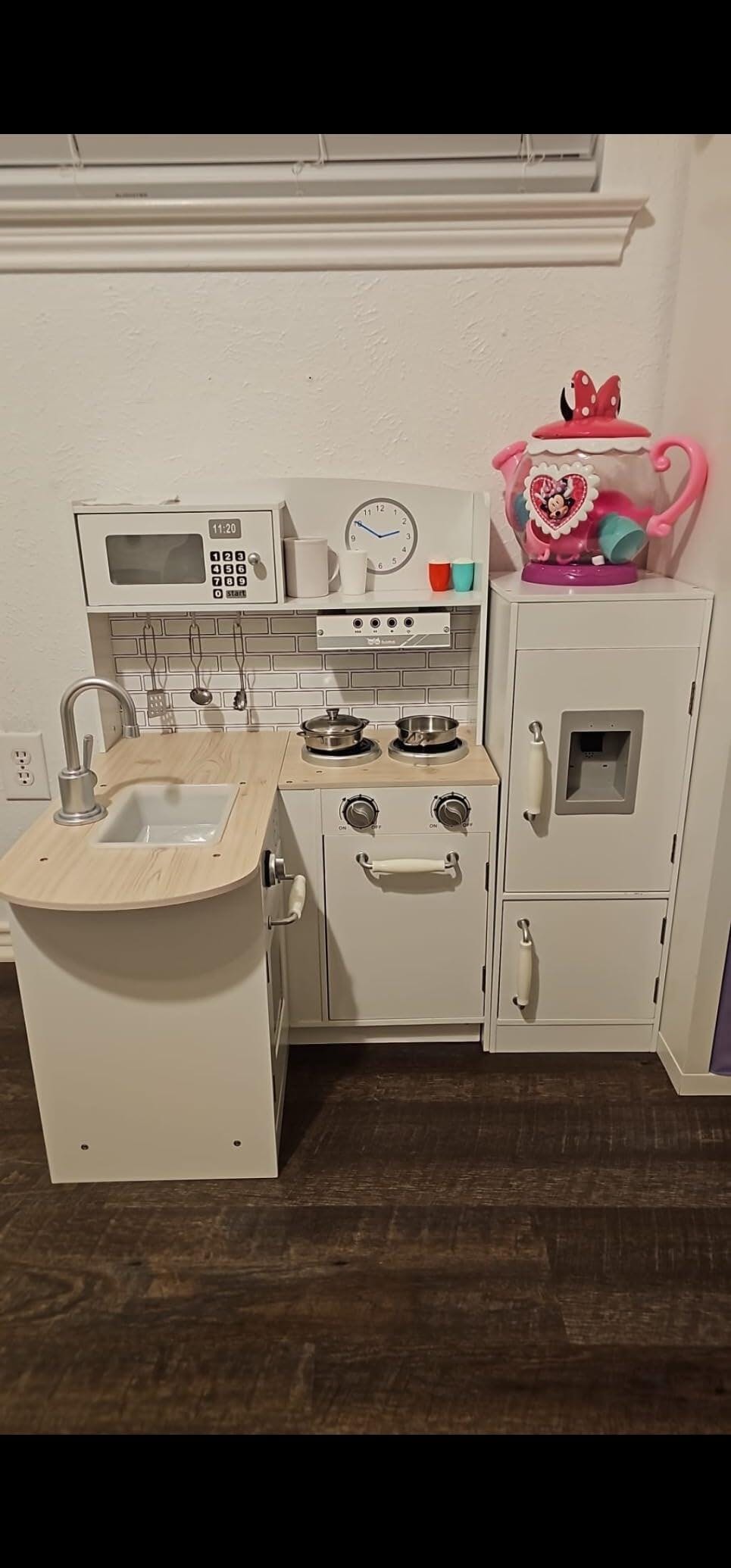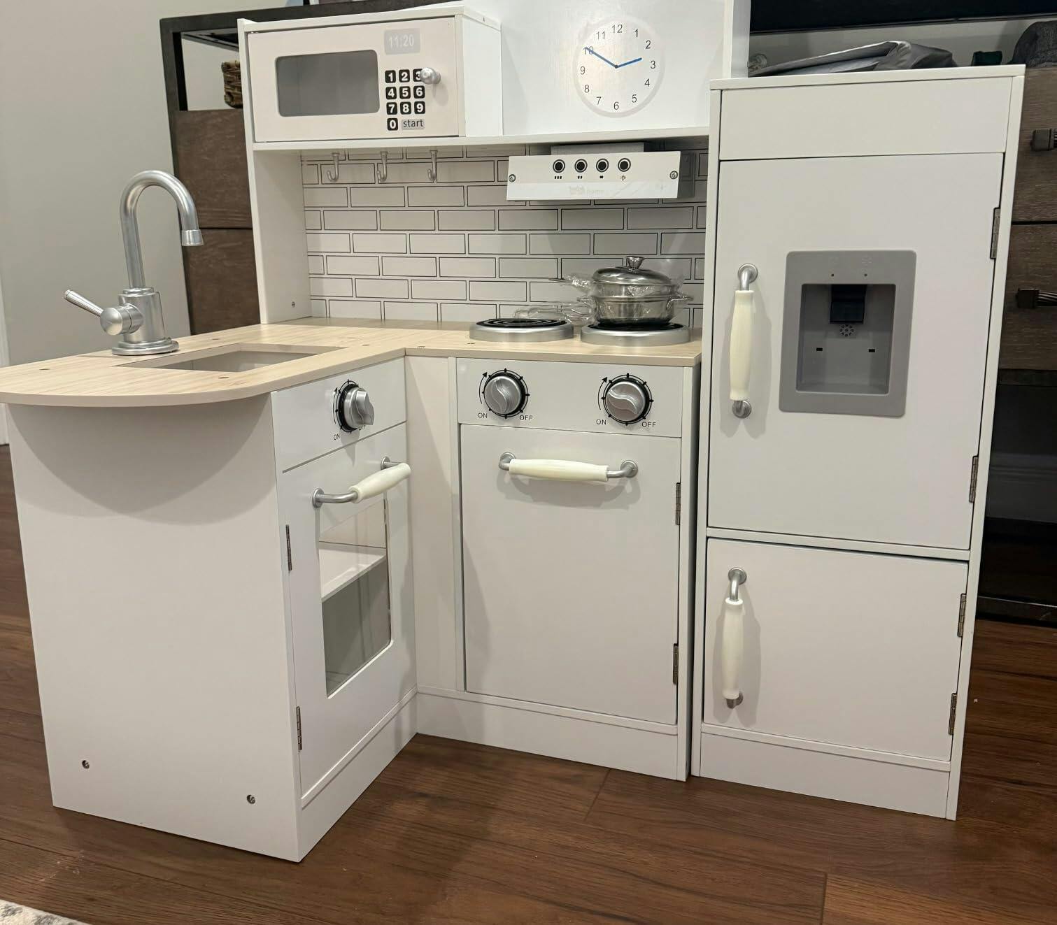 - All-in-1 Kitchen Playset - This kids corner cooking set is a miniature of a real kitchen in your home. It's composed of a range hood, stove, oven, microwave, water dispenser, refrigerator, sink & faucet, and a storage cabinet. These rich appliances bring kids to a wonderful game world while developing their cognitive ability, hands-on ability and social skills.