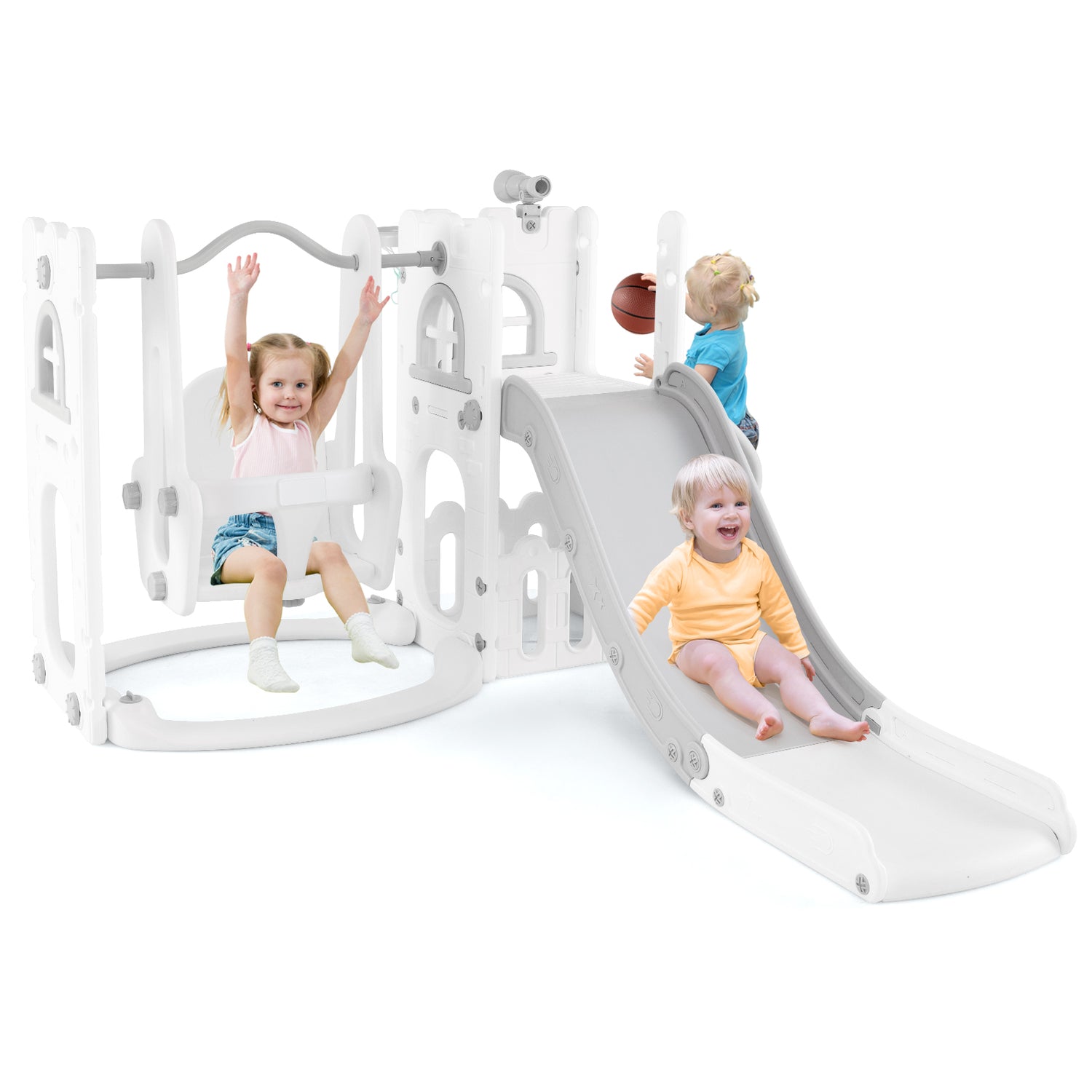 - 7 in 1 L-Shaped Toddle Slide: The Kid slide offers multifunctional fun with a telescope, climber, slide, swing, basketball shooting, hiding spot, and storage space. This kids' slide for kids is a complete entertainment hub that keeps your child engaged and active.