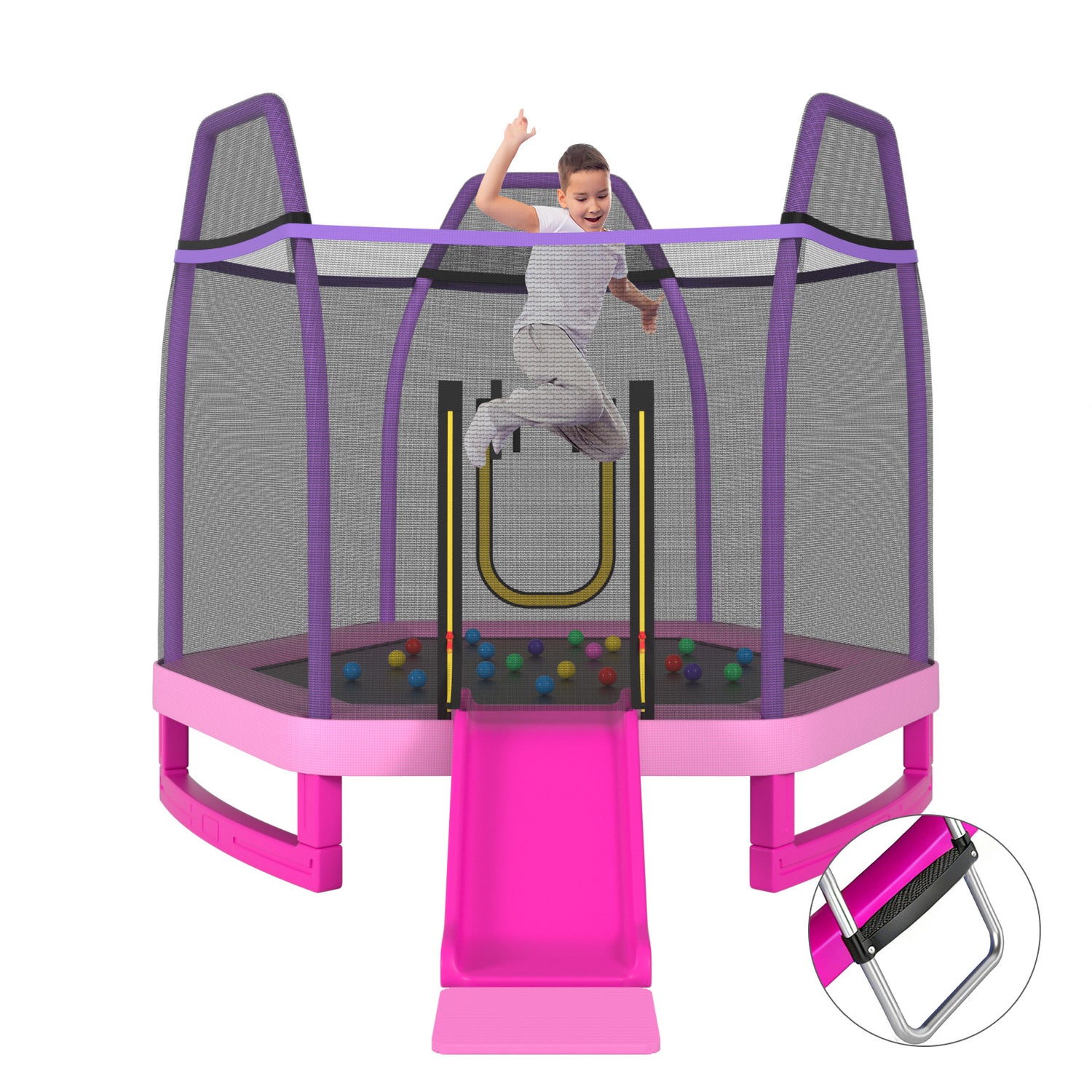 - 😛【3 in 1 Design】 This 7 ft kids trampoline is comprised of a trampoline, slide and ladder. And 20 colorful ocean balls are included. Thus, the toddler trampoline creates a place for kids to jump, slide and climb, during which they can experience the fun of various games.