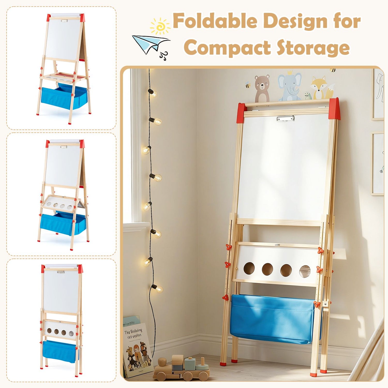 Quick Folding for Storage: The kids easel can be folded flat for compact storage and portability, making it ideal for home, classroom, or travel use. The folded easel measures 56 x 8 x 150 cm(L x W x H).