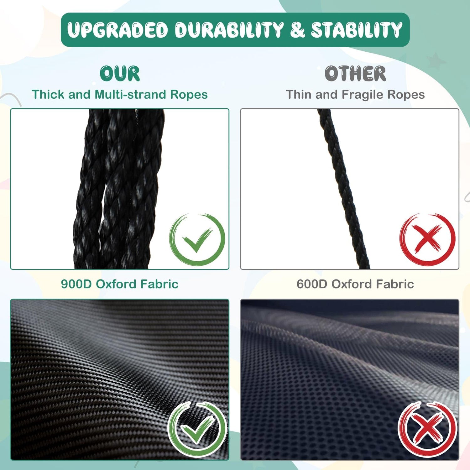 Allow kids to enjoy swinging with this 102cm saucer tree swing!Compared with other swings with thin and fragile ropes, our swing seat with thick and multi-strand ropes is safer. Similarly, the 900D oxford fabric features upgraded durability & stability than 600D oxford fabric. The large seat permits 2 kids to enjoy their wonderful leisure time at the same time. Moreover, you can hang the tree swing with 1 point or 2 points for varying fun. And the ropes can be adjusted from 118 cm to 173 cm based on various needs. More importantly, the clear user's manual and complete accessories make assembly a breeze. You can use it various occasions, such as backyard, living room, kindergarten, etc.