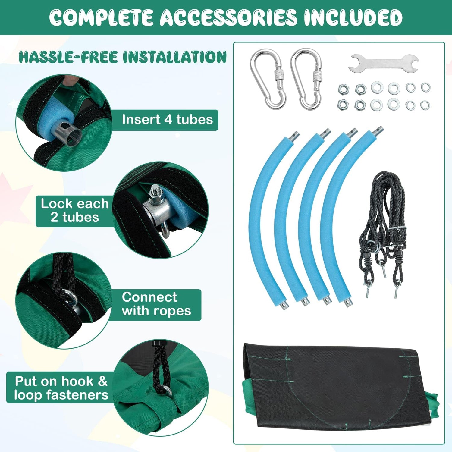 - Hassle-free Installation: With detailed instruction and complete accessories included, the flying swing seat can be easily installed. You can do the following steps to finish installation: ① Insert 4 tubes. ② Lock each 2 tubes. ③ Connect with ropes. ④ Put on hook & loop fasteners.