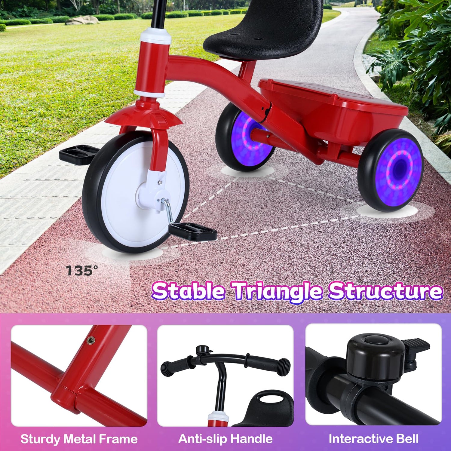 Illuminating Wheels & Playful Bell: Watch your child's imagination come alive as glowing rear wheels create a dazzling light show with every pedal stroke - no batteries needed for continuous fun. The toddler tricycle's interactive bell adds extra excitement, turning ordinary rides into magical adventures.