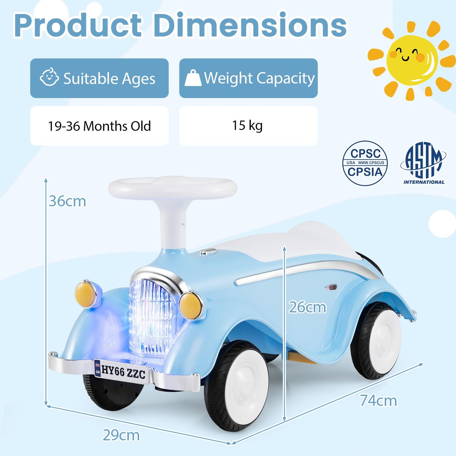 Designed with a curved, anti-falling seat, this foot-to-floor car is safe and cozy to ride. The under-seat storage compartment is ideal for organizing your child's belongings. Thanks to the 36° limit steering and robust 4-wheel support, the ride on toy car is more secure and stable. Kids can enjoy the horn sound and bright LED lights with just a push of the button. Moreover, the wear-resistant and anti-skid wheels ensure smooth and quiet rides on various surfaces. Featuring a retro appearance, this ride on toy promises endless hours of joyful exploration both indoors and outdoors. As a perfect gift for toddlers, the ride on car is conducive to their development, helping promote balance, motor skills, leg muscles, confidence, and more.