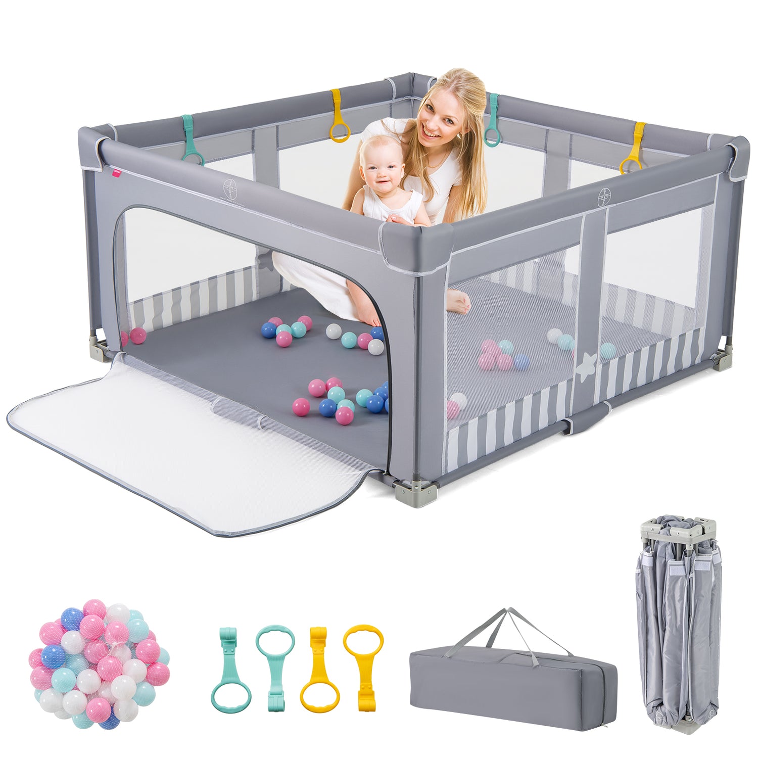 - Easy Access & Engaging Fun: This play yard is equipped with a convenient zip-open side door that offers easy in-and-out for babies and toddlers. Included accessories are 50 colorful ocean balls and 4 pull-up rings to promote physical activity and motor skills development.
