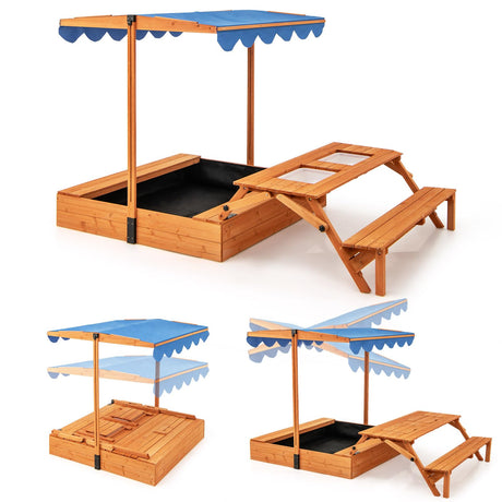 Kids Wooden Sandbox with Canopy, Outdoor Large Fir Wood Playhouse w/Bottom Liner