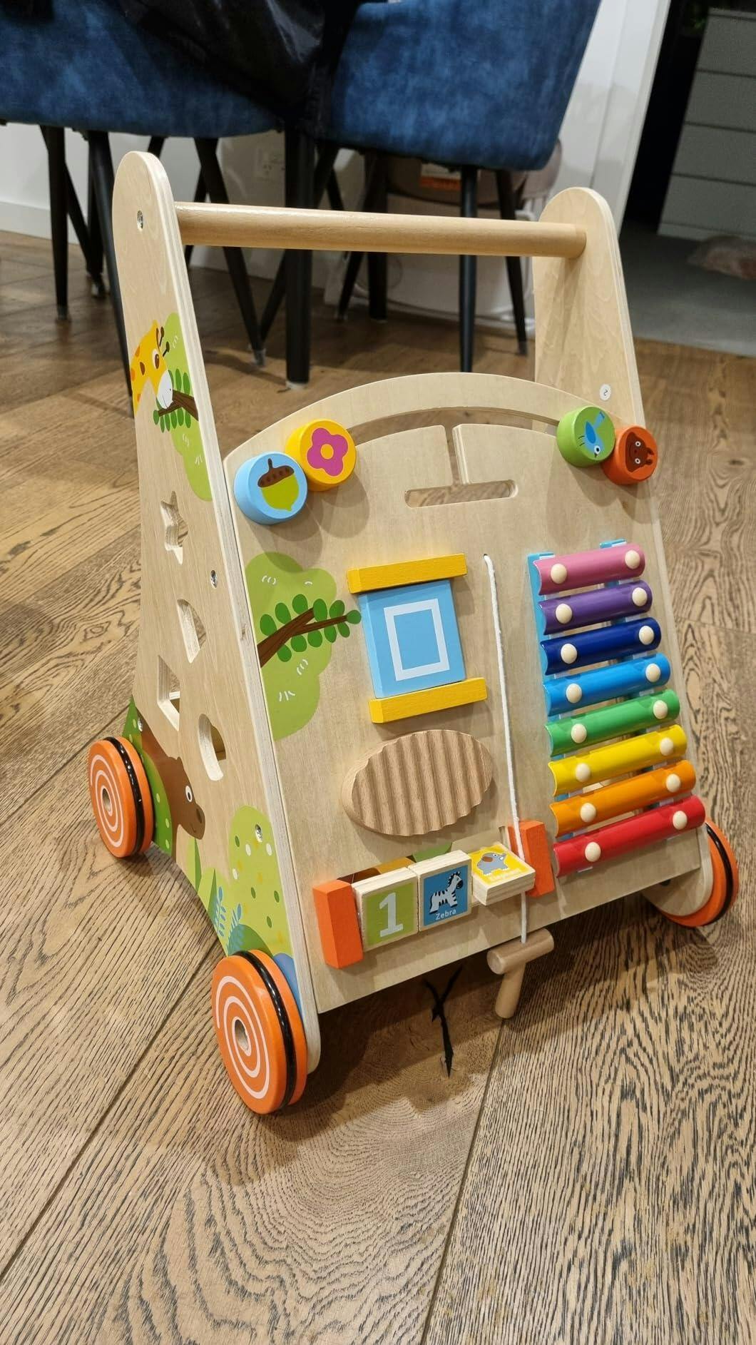 Absolutely love this product! Our 10 month old has played around with the front of the board everyday since we put this together, and has even tried to start walking with it - Not long to go now! It doesn't overwhelm her with loud sounds which is wonderful, and she especially likes flipping around the "1,2,3" numbers and hearing the sounds it makes. To be completely honest, dad and I have a bit of fun with the xylophone part too. Absolutely recommend - 5 out of 5 stars!