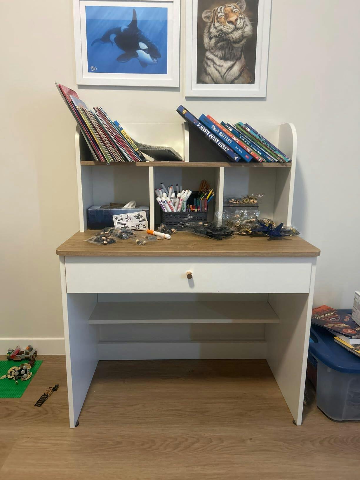 This fits well in child’s bedroom. Shelves are great for books and school things essentials and the design makes the space feel more organized. Assembly doesn’t take a bit of time once it’s put together it felt solid and stable . Great for kids that have small room.