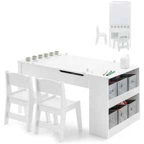 This unique kids arts and crafts table set has a liftable tabletop, which allows you to transform the table to a kids art easel. The tabletop is lifted by a durable hydraulic rod, which brings slow lowering for safety. The cutout handle also protects your little one from accidental injuries. This art station offers lots of storage options for various supplies, including spacious tabletop, hidden storage compartments under the tabletop, 6 removable fabric bins with handles on 2 shelves and 6 paint cups. This multifunctional kids activity table and chair set is suitable for various scenarios, such as play room, kids bedroom, kindergarten, daycare, etc.