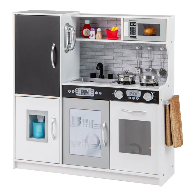 - Selected Material & Safe Design: Made of high quality and BPA-free material, this pretend play kitchen promises to accompany your kids to grow up. The rounded corners & edges are friendly to kids' delicate skin. More importantly, you can fix the toy kitchen to the wall with the anti-toppling device to ensure security.