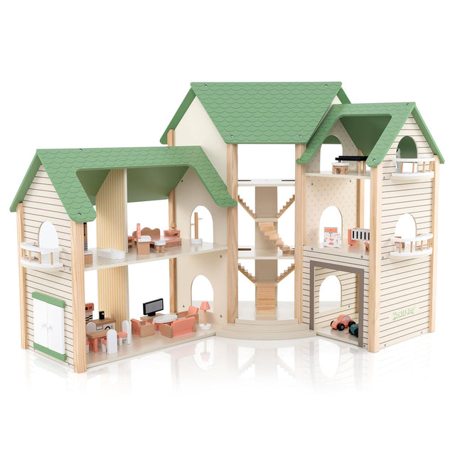 Let kids' playtime meet creativity with our wooden corner dollhouse playset!With its unique corner design, this doll house effortlessly fits into any room corner to maximize play area. The doll house boasts 3 levels, 6 rooms, and 34 pieces of furniture, offering endless layout possibilities and fostering kids' creativity, fine motor skills, and organization. The balconies and garage enrich the role-play experience. Children can also invite friends to join in hours of engaging play, enhancing their social skills. Made from sturdy pine wood, the pillars and stairs ensure the overall steadiness. Featuring a charming appearance, this wooden dollhouse is an ideal gift for kids over 3 years old.