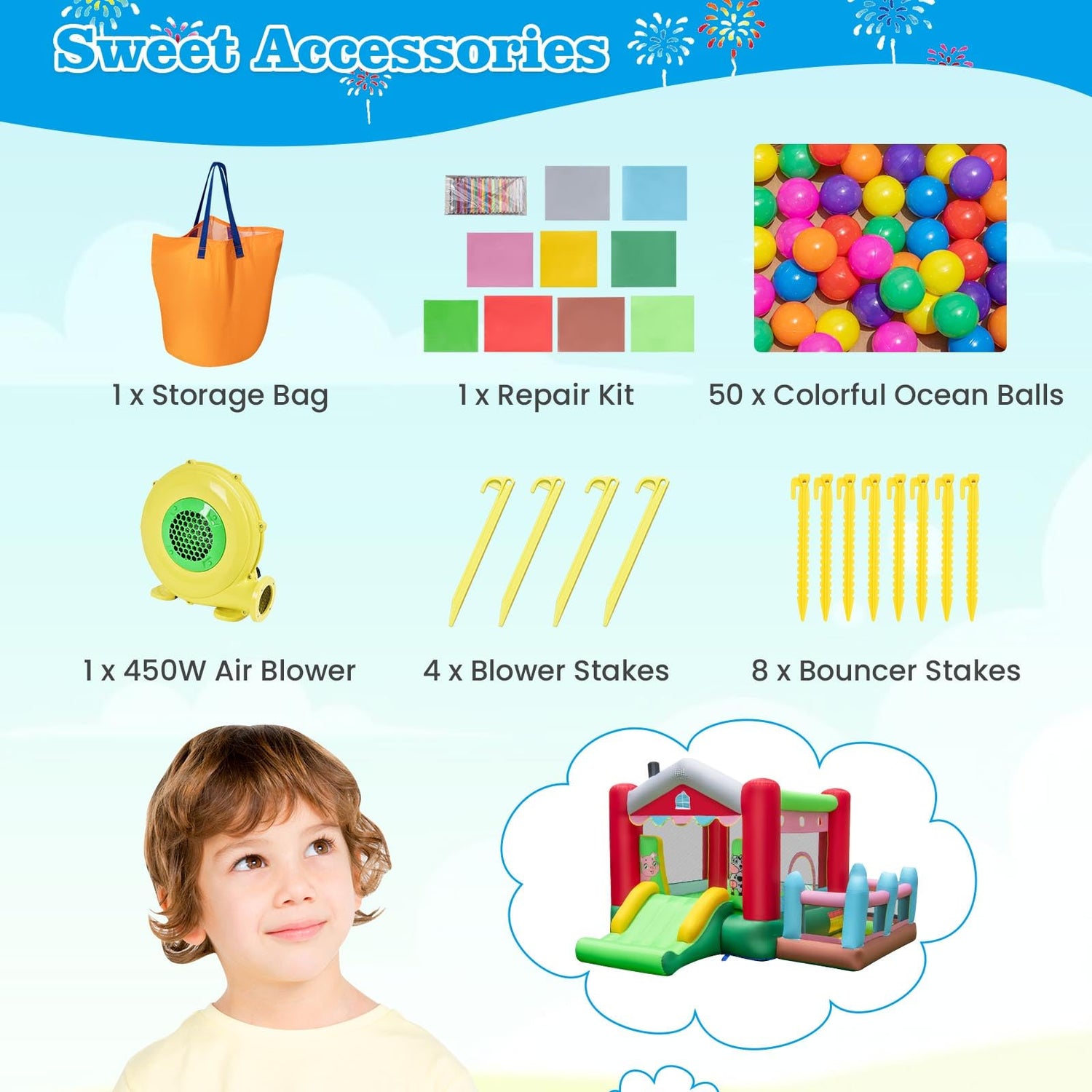 Step into our 4-in-1 bounce house, designed to deliver unstoppable fun! Featuring a slide, jumping zone, ball pit with 50 colorful ocean balls, and a basketball hoop, it's a perfect party starter. Crafted with care from long-lasting 420D oxford fabric and outfitted with double stitched seams and protective mesh walls, this bounce castle provides secure, enduring playtime. Effortlessly set up in a flash with our included 450W blower and relax knowing everything is stabled with sturdy ground stakes. Plus, with sweet accessories like a handy storage bag and a repair kit, this makes an enchanting gift for children's birthdays or Christmas.