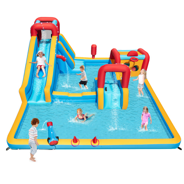 Children will be delighted by the variety of activities offered by this inflatable water park, including a water slide, climbing wall, boxing post, small ramp, water cannon, and splash pool. Competitive play features like a basketball rim, ring toss game, and target game promote social skills and coordination. Therefore, kids can discover varied adventures. Safety is ensured with strong Oxford fabric, mesh walls, and elevated handrails for stability. Perfect for carnivals, birthday parties, family reunions, and school events, this portable entertainment option can accommodate up to 5 children aged 3-12 years. Breeze through setup and easy to maintain, the water park comes with a powerful blower, ground stakes, a repair kit, and a carrying bag for storage.