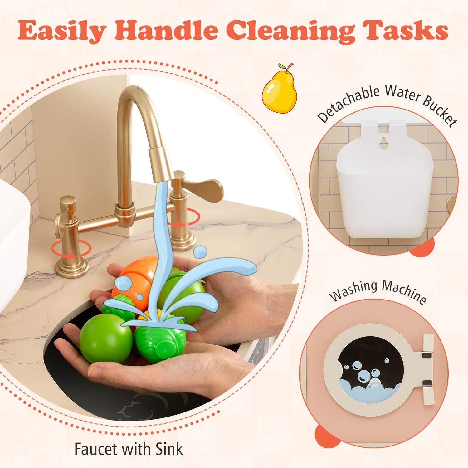 Ignite your child's imagination with this vibrant kids cooking playset, featuring 25 delightful accessories. It boasts 2 stoves with lights and sounds, rotation knobs that click, washing machine, microwave oven, coffee machine, toaster, and ice dispenser. Also, it has an integrated oven to fulfill children's little baking dreams. The cutting board with knife allows kids to enjoy the simple moment of slicing fruits apart. More, little ones will love the interactive cleaning area, complete with a faucet, sink, and removable water bucket.Crafted from sturdy natural grass-tree wood with smooth surfaces and rounded edges, this enduring pretend kitchen ensures safety and lasting fun.
