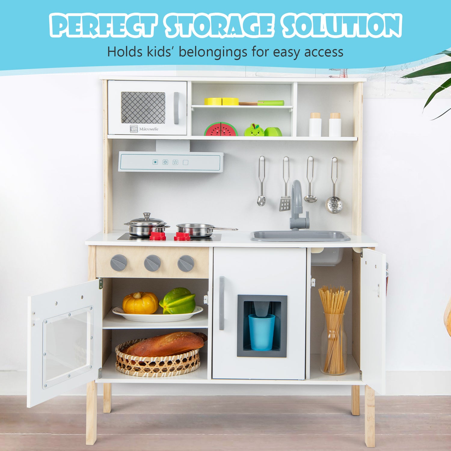 The kids play kitchen mimics a real kitchen, featuring a microwave, range hood, stoves, sink, oven, ice maker and abundant accessories. With their unlimited imagination and creativity, children are able to do a variety of things to enhance their hands-on ability as well as social skills. Additionally, this pretend play kitchen is made of BPA-free materials and has been approved by EN71, which makes it safe for toddlers. Kids can organize all the accessories and other items in the spacious storage space. Also, the hooks and towel rack bring extra storage. Furthermore, in order to make the play kitchen more stable, you can attach it to the wall with the anti-toppling device.