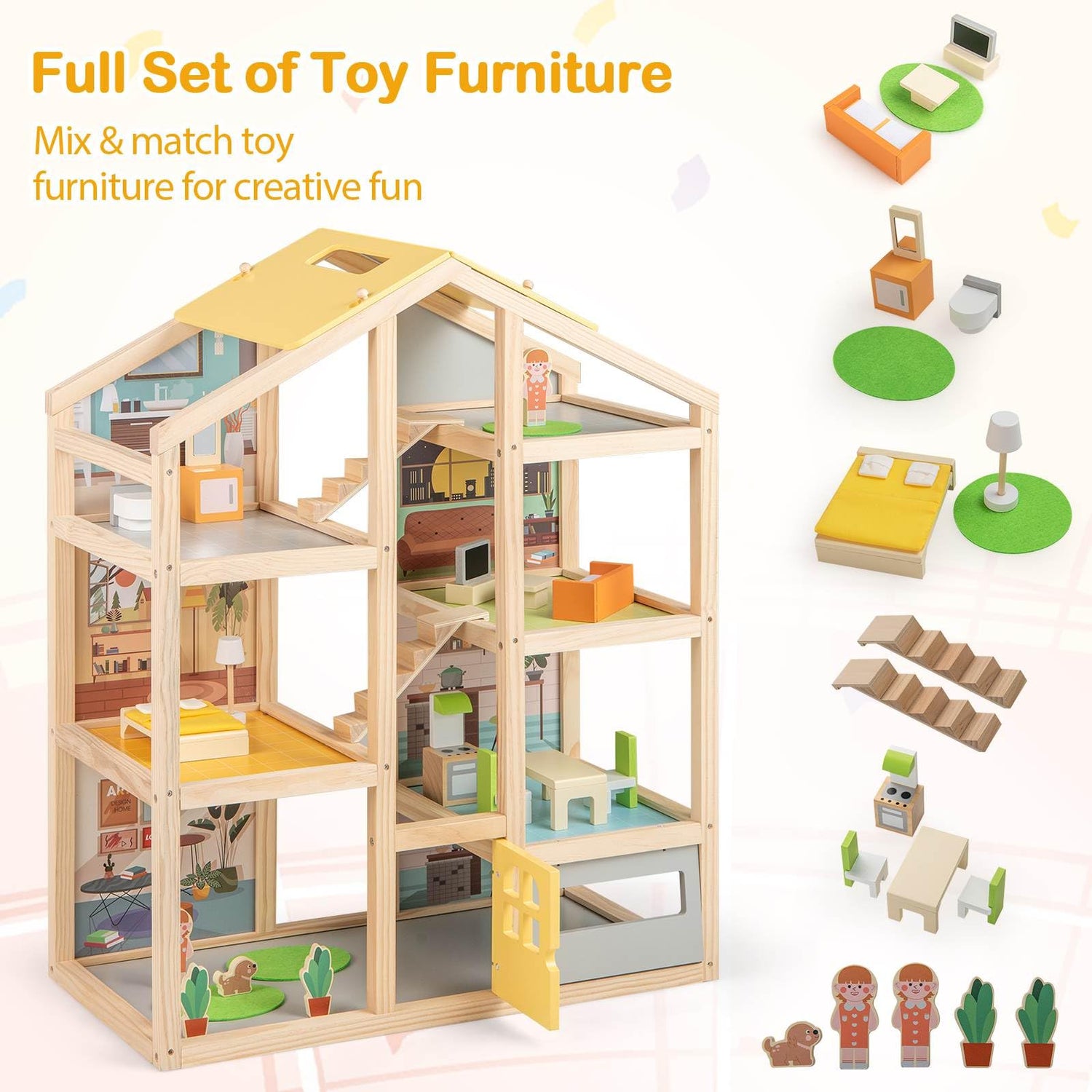 Wooden Dollhouse for Kids, Modern Family Pretend Playhouse w/Furniture Pieces & Figures